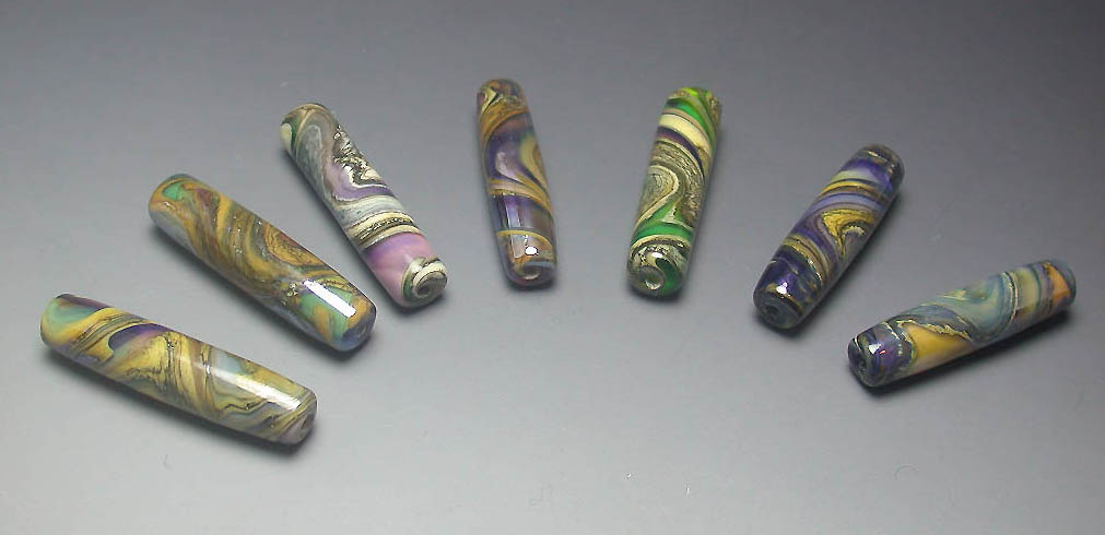 Lampwork Beads Strata are bands of different colored or differently structured material exposed in cliffs, road cuts, quarries, and river banks. Living in a mountain community, there are many cliffs and mountains nearby. I was inspired to capture the striations of the cliffs in glass, thus the name of this series. For Tucson 2008, while prototyping the Sandstorm series, the Strata Metallic series was born. This organic bead and it's finish compliments iris, AB, satin and luster beads well. These tube beads range from 1.5" to nearly 3". All beads are individually packed, wrapped in tissue paper and shipped bubble-wrapped via US Priority with delivery confirmation. For additional shipping and ordering details, visit the Ordering page. When emailing your order, please include the item number(s) and a short description. An invoice summary will be emailed to you within 24 hours, unless I am out of town.