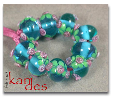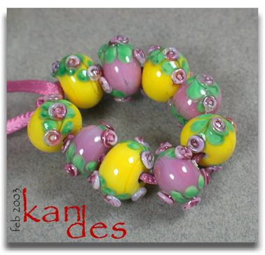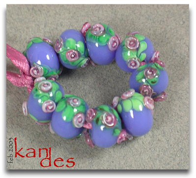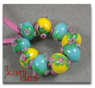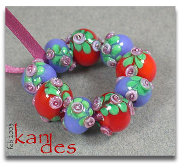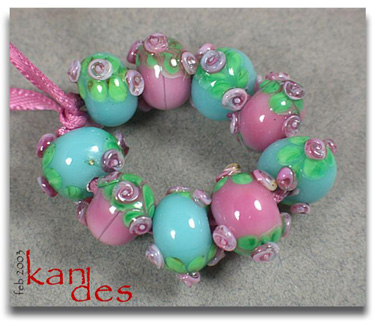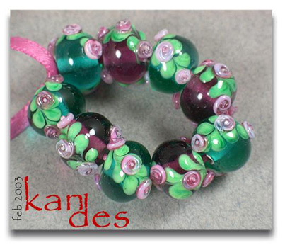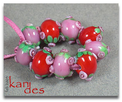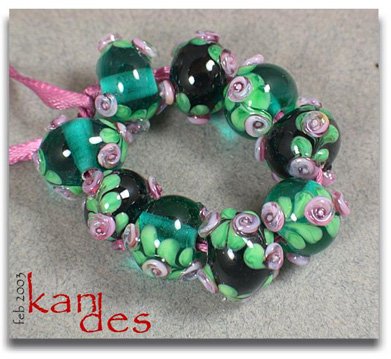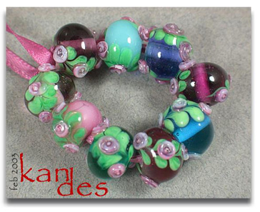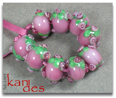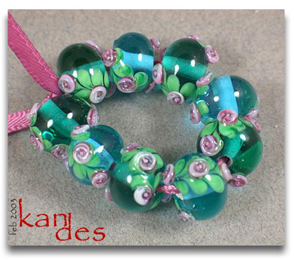 Lisa Kan Lampwork The Eden Series features two spiral embellished rosette trails on the surface of the bead. The Garden of Eden Series grew from that basis to include two larger flowers at the center of each spiral trail with the addition of some smaller berries or blossoms. Don't forget to scroll down to the bottom for additional pages to this series.