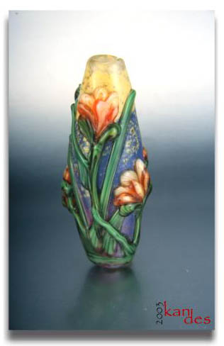 The Le Fiore Vive series was born on Sunday 12/29/02 and averages 1.25 to 2.50 inches lengthwise - a miniature canvas - as I like to work on the small scale. Le Fiore Vive is Italian for "The Living Flower". And in glass, the beauty of these flowers will indeed live forever. Many of my creations are inspired by mother nature's colorful palette. All the flower colors are custom blended to create the 3D effect and depth. It takes 2 days to make each bead, from the custom blended floral canes to the execution of the bead itself. Using glass as my paintbrush, 2.5mm to 3mm custom blended canes, are slowly "painted" on petal by petal then stem/leaf canes are added carefully, while keeping the surface decorations un-melted for a 3D effect. I hope you will drop by often to see the numerous flowers I intend to add to this series over time. The beads are fully decorated on the entire circumference of the bead surface. This series has taken a metamorphoses and improved over the years. Sometimes, I offer this series in watercolor versions using enamels (fine powdered glass). For the time being, since Tucson 2006, I re-introduced this series with new shapes (vases and tubes) and longer stem freesia-like flowers. Previous pieces to this series can be viewed in the Gallery. In April 2003, the Le Fiore Vive beads were selected to be part of James Kervin's Book More Than You Ever Wanted to Know About Glass Beadmaking, 5th Edition. In February 2005, Lark Books also selected the Le Fiore Vive beads (watercolor versions) for inclusion in Kimberly Adam's, The Complete Book of Glass Beadmaking.