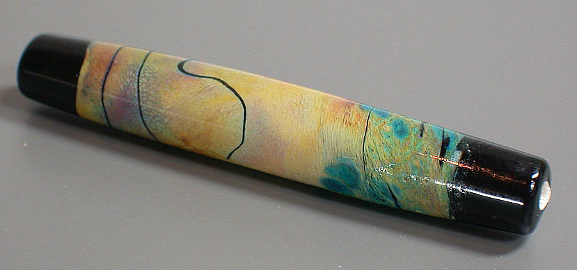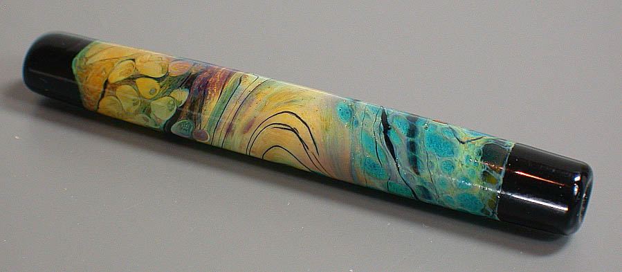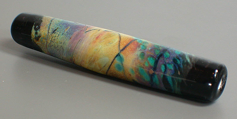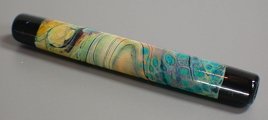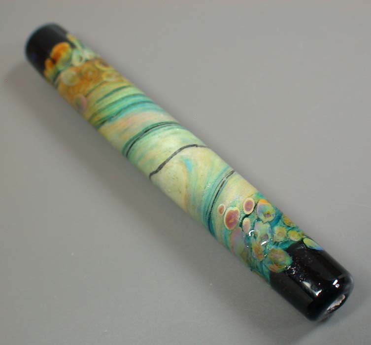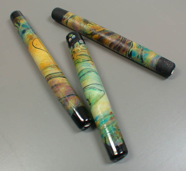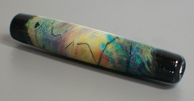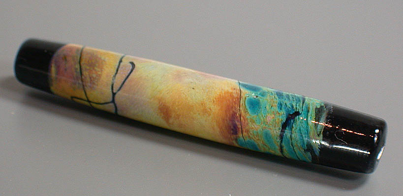Lisa Kan Lampwork The Mesa series was created for Tucson 2005, my first major show. Since it was the first time I attended and exhibited my glass work in Tucson, I wanted to create a focal series to pay tribute to the Southwest. As a fan of turquoise and silver, it is no surprise that I am also a big fan of Southwest arts and crafts. Each focal contains a painterly approach of my interpretation of the Southwest. The colors in this series are predominantly burnt oranges, tans, turquoise blues, raw umber and sienna. Each bead is framed with a black border as if the bead was a painting. The colors lend themselves well when combined with turquoise beads and whether just strung up or in a crochet rope design, you will have a little bit of the Southwest near you at all times. The focals are very fun to make because of the randomness of the swirls (as if the wind was blowing) and the unpredictability of the final colors. Some of the Mesa beads are etched to give them a soft worn look and feel. These tubes range from 1.75" to nearly 3".