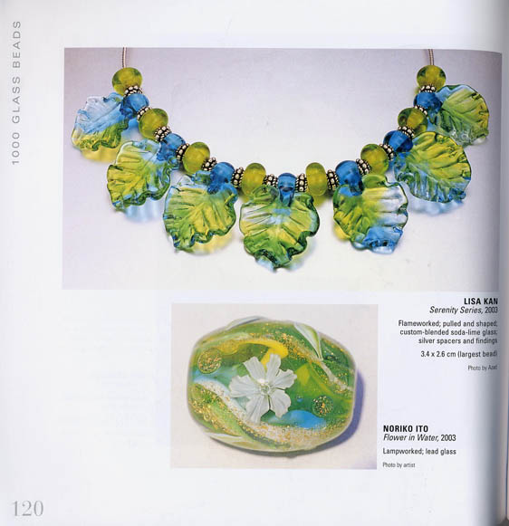The Serenity Series was selected to be part of Lark Book's 1000 Glass Beads (pictured above). You can find me on page 120. The "Serenity" series represents tranquil days where you may find yourself lounging and relaxing under a shaded tree, perhaps sipping an icy cold glass of lemonade or ice tea, looking up at the night sky, counting the stars and then listening to the cool whispers of the leaves singing in the breeze. The harmonious change of colors in the leaves represents nature's seasonal color changes. Each leave is individually sculpted to create the feeling of leaves rustling in the wind. The finished necklace with just a few Bali spacers, shown above, illustrates one of the many ways you can easily design a dazzling look. For additional color variations of this series visit the Lampwork Gallery or to order in stock colors, visit the catalog. More colors are constantly being developed. (Photo by Azad).