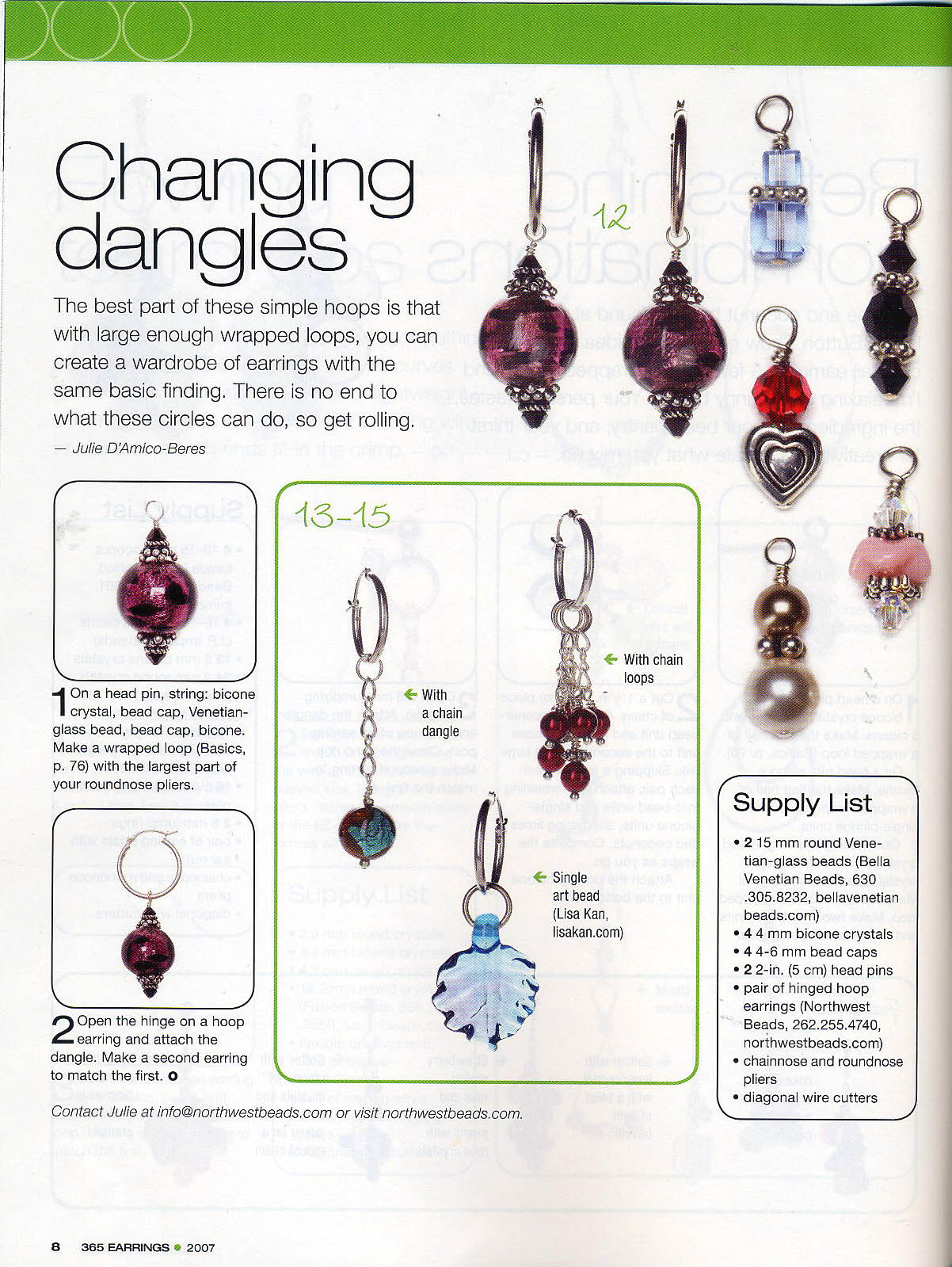 Special Issue: 365 Earrings I was pleasantly surprised a few months ago when BeadStyle magazine contacted me by mail and informed me that they were using the Serenity leaves left over from Naomi Fujimoto's Cool Jewels project, Chainy Days, for their special issue: 365 Earrings. A girl can never have too many earrings so why not create one for every day of the year? This issue has lots of fun ideas and one of them uses a big jump ring to connect a Serenity leaf to a hoop earring finding for interchangeability (page 8). There are plenty of inspiration in every page. Thanks goes to Julie D'Amico-Beres of Northwest Beads for using the Serenity leaf in her project!