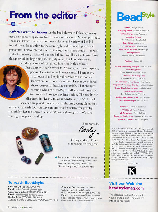 Bead Style Magazine: May 2006 I met Mindy Brooks, Editor of Bead and Button Magazine, in Tucson last year when I exhibited for the first time at the To Bead True Blue Show at the Manning House Mansion. This year Mindy visited my booth again and brought along Cathy Jakicic, Editor of Bead Style Magazine, Bead and Button's sister magazine. Mindy and Cathy bought some of my beads but imagine my surprise when I received the May issue of Bead Style Magazine. Cathy pointed out in her editorial comments, on page 6, that I was amongst her favorite artists she discovered at her first Tucson show. (Click the above "From the Editor" photo for a larger view.)