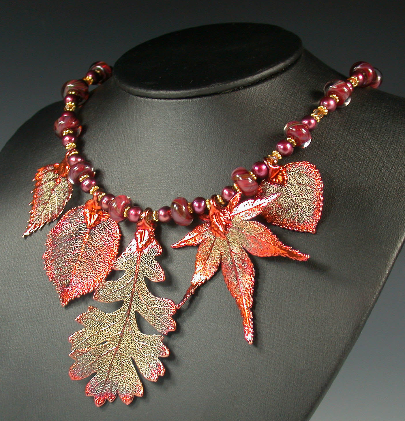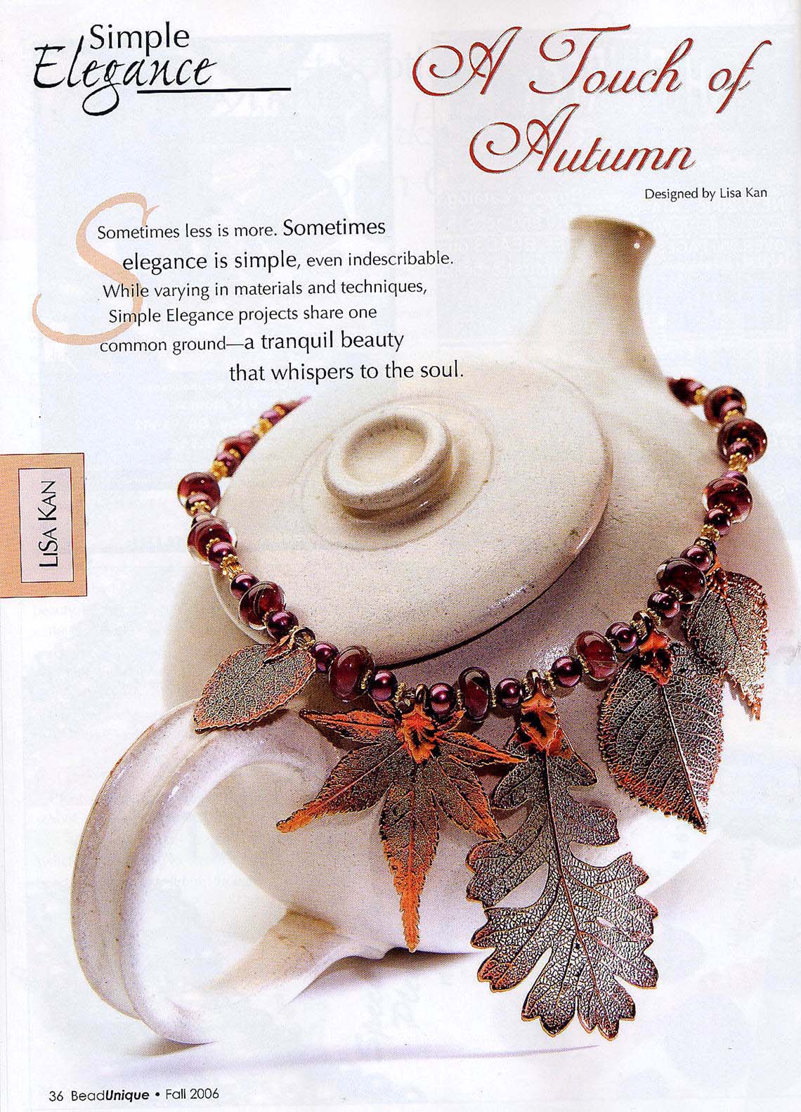 Bead Unique Magazine: Fall 2006, Issue #10 Issue #10 of Bead Unique Magazine contains the A Touch of Autumn necklace project featuring my handmade borosilicate beads combined with a new product I am carrying, electroformed leaves. The design is straightforward and simple but the combination of the two is what makes the piece spectacular. It is a celebration of the coming Fall season . The leaves featured in the necklace are (from left to right): birch, rose, lacey oak, Japanese maple and aspen in the exclusive iridescent rose gold finish (24kt gold and copper). These are real leaves that have been preserved in metal through the magic of electroforming and each is a work of art.