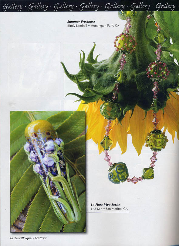 Fall 2007, Issue #14 Bead Unique featured the Le Fiore Vive series in their previous Summer 2007 issue #13. Although it was an honor to be part of the Bead Unique gallery, they made an error and credited my work to Alethia Donathan. Alethia is a wonderful artist from Hawaii but we each have our own unique styles. When I informed Bead Unique Magazine of this error, they offered to reprint a new photo in the Fall issue. As you can see above, the Le Fiore Vive bead is now correctly credited. I appreciate the correction and clarification.
