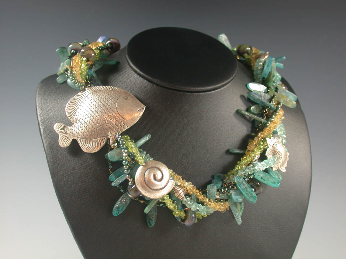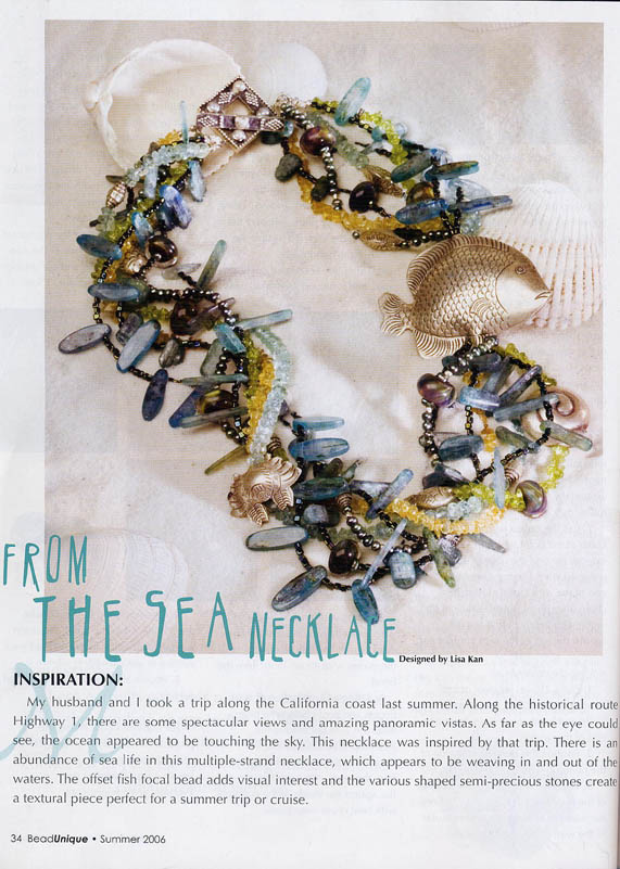 Bead Unique Magazine: Summer 2006, Issue #9 Issue #9 of Bead Unique magazine contains the From the Sea multiple strand stringing project. You will find the article beginning on page 34. The necklace has an abundance of sea life which appears to be weaving in and out of the waters. The offset fish focal bead adds visual interest and the various shaped semi-precious stones create a textural piece perfect for a summer trip or cruise. (Click the photos above for a larger view).