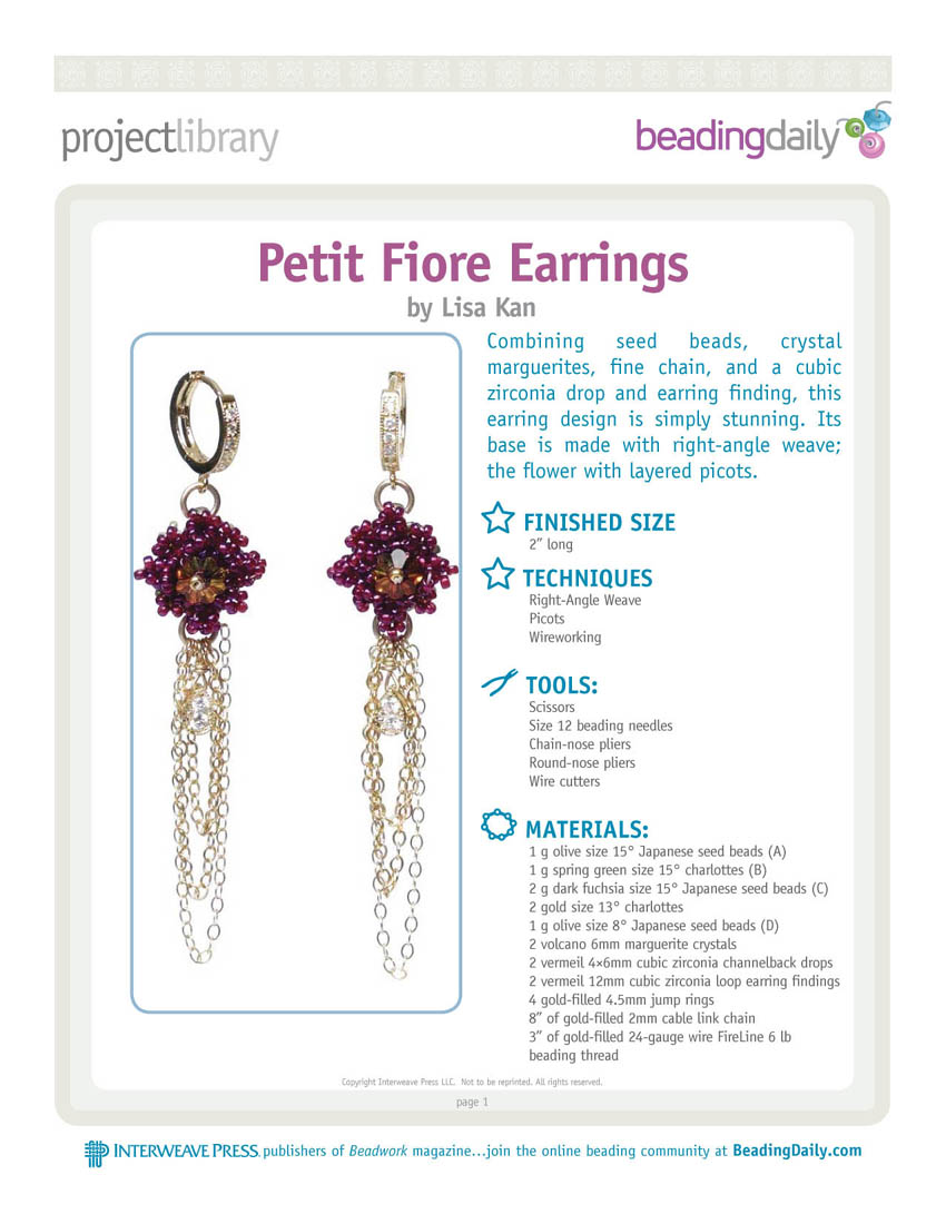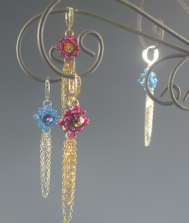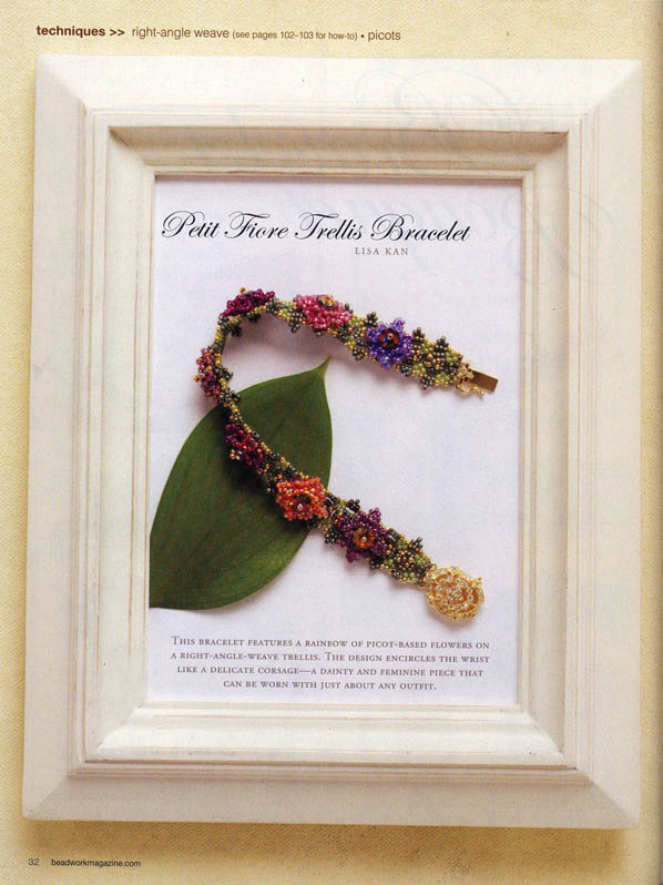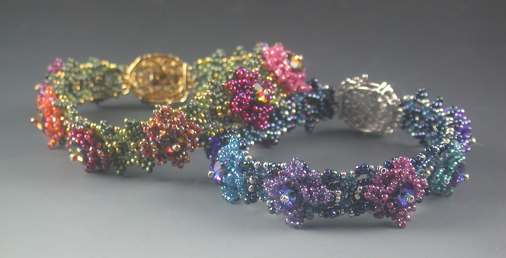2008 The April/May 2008 Beadwork continues to offer projects to their readers which we did not utilize in Bead Romantique. In the Petit Fiore bracelet and matching earrings (available FREE on Beading Daily), I've used the versatility of right angle weave with picots to create a corsage of colorful flowers for your wrist. The margarites add a bit of sparkle to each flower center and the Ezel Findings clasp/earring findings add a bit of the glamorous finishing touch. I love using chain in beadwork too, if you haven't noticed, which add fluidity and movement to the earrings. And yes, size 15/o's do the trick too to give the pieces a fanciful delicacy! You can see that I also made a silver version of both bracelet and earrings which I gifted to my friends at Ezel Findings. Enjoy these projects and keep your eyes peeled for more in the upcoming year!