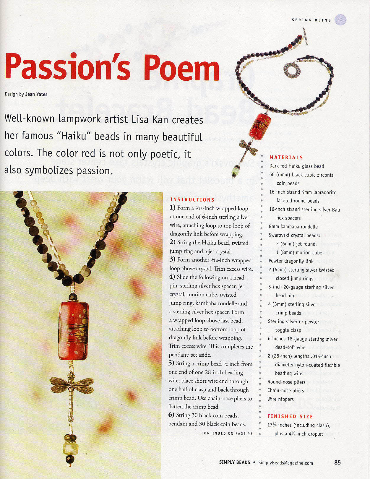 Time for celebrations. YAY. Hooray. Whoopee. (jumping up and down!) My excellent pal and fellow designer, Jean Yates, never ceases to amaze me. In our latest collaboration, Jean's Passion's Poem for Simply Beads April 2008 Magazine, features a Red Haiku bead. The Haiku bead has been made in many colors but the red version is extra special. Red symbolizes different things in many cultures. However, what is most common in most cultures is that the color symbolizes love and passion. In Chinese and many Asian cultures, the red color also symbolizes good fortune, luck and prosperity. Although generally pertaining to wealth in the monetary sense, for me the Red Haiku symbolizes my good fortune, luck and prosperity of creating wonderful friendships through my beads. And Jean was able to exude this feeling in "Passion's Poem". THANK YOU Jean. This is the second cover that Jean and I both have been on together. We first met through Jamie Hogsett and Stringing Magazine Spring 2006 issue, where we both shared that cover! YAY!